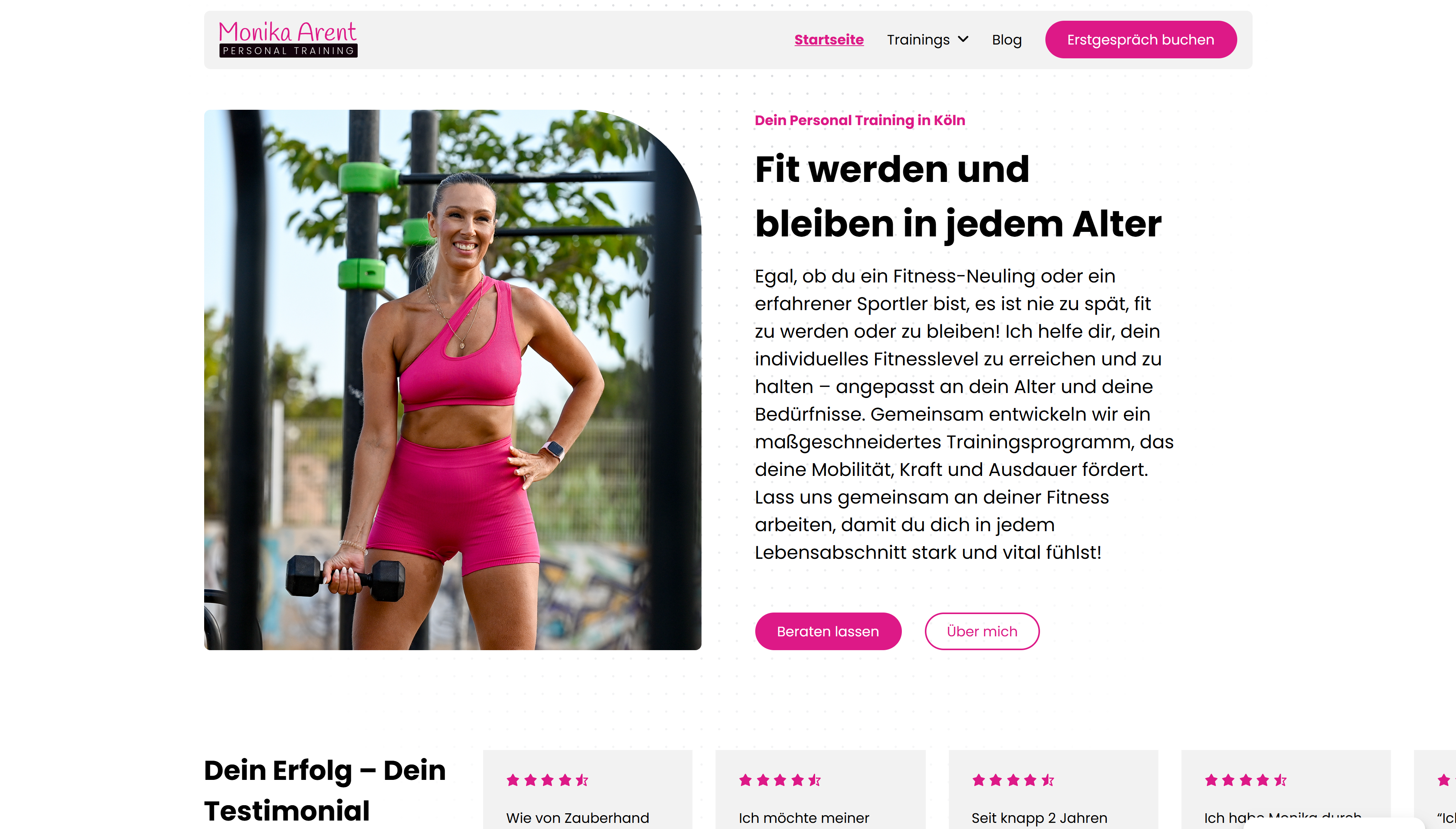 Für die Personal Trainerin Monika Arent aus Köln gestalteten und entwickelten wir Ihre erste eigene Website. Die Website repräsentiert nicht nur das breite Leistungsspektrum und ihre Qualifikationen, sondern auch sie selbst als Person. Interessierte können direkt über die Website einen Termin für ein Beratungsgespräch buchen.